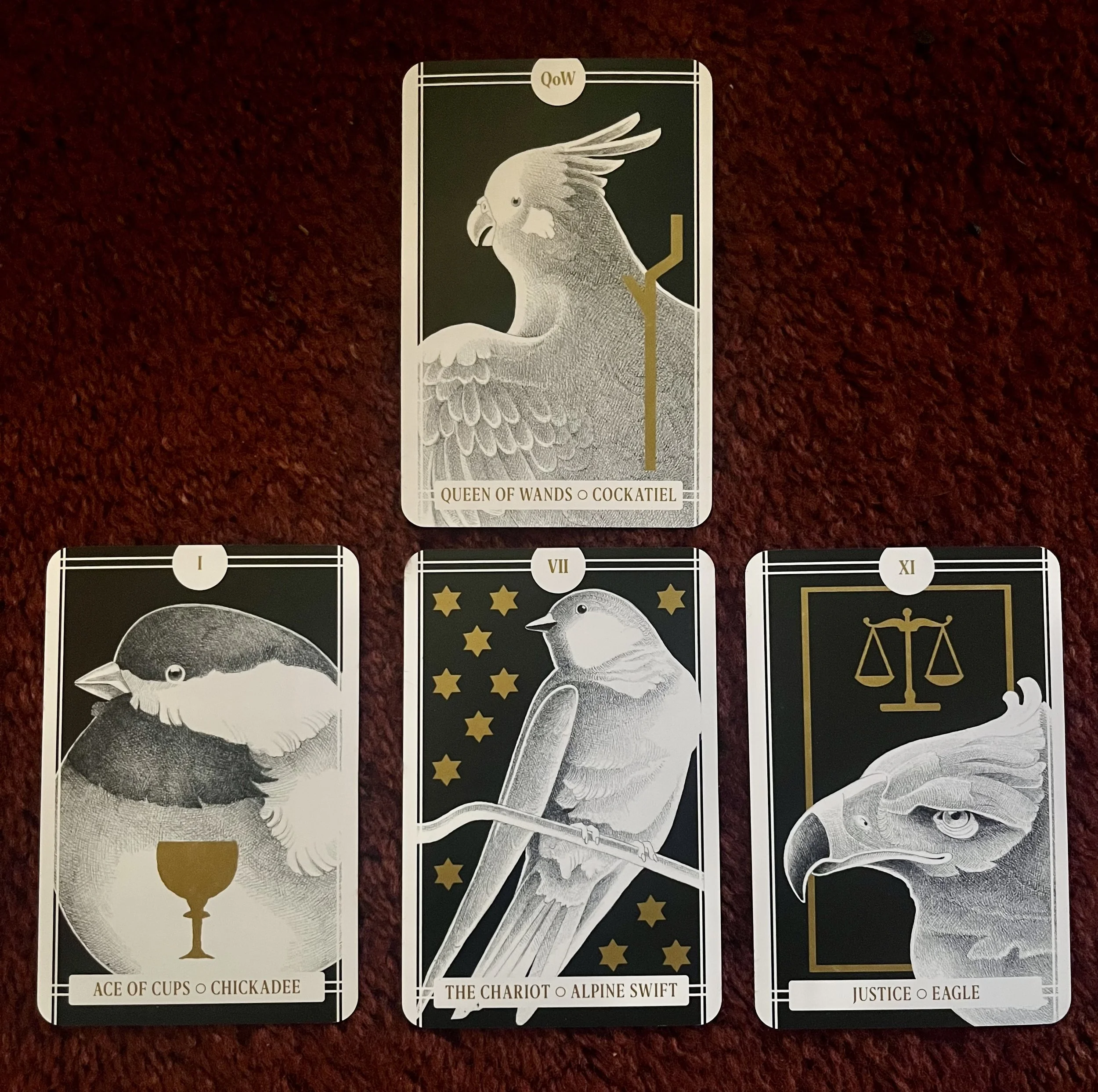 The key to this reading is the Queen of Wands/Cockatiel. It is time to soak in all of the good things that are coming your way. Be the Queen of Fire- ready for any change. You are quite literally on fire, creating the life that you want. Lean into your power, passion and creativity. Enjoy the fire that you have worked for and created. Follow your spirit and instincts to get to where you are meant to be. Just like the Cockatiel, be colorful and proud- not afraid to stand out or show your talents.
