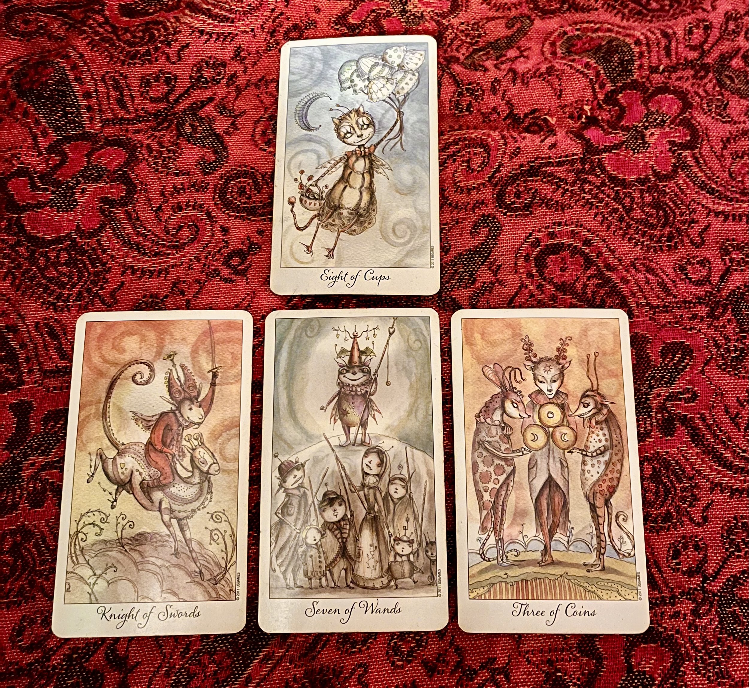 The key to this reading is the Eight of Cups. This is an image of someone floating away with balloons. Take a break if you need to. Something may feel off or like it's not coming together as you would like it to. You may need some space moving into this week, and it may be the key to making you feel better. Step away from everything. Don't be social if you don't want to be. Float off into the night. Nothing chains you to the earth- you can do what you need to do to stay at peace.
