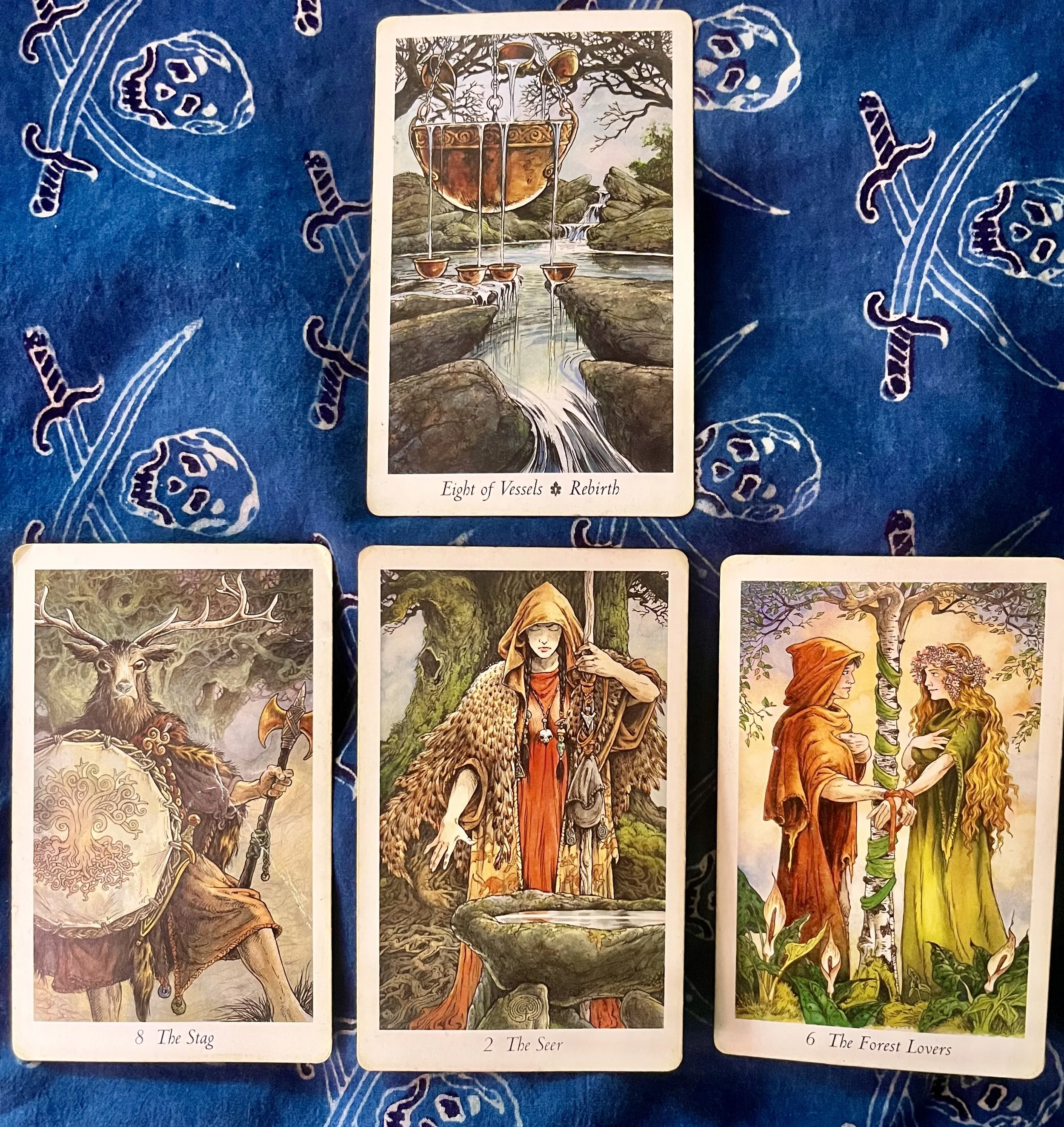 The reading begins with The Stag, which represents Justice in this deck. This is a card of power and accountability. When we see this card, there is something that is meant to be which will happen. The scales go back into balance, and the truth is known and understood. If this is your reading, there is something in your life that has been unfair and out of balance with the way that things are meant to be. The universe is self correcting, and you will soon feel the circumstances of your life return to a place of balance and justice.